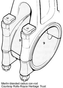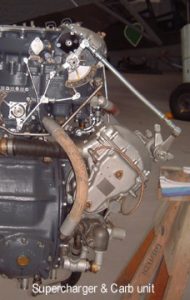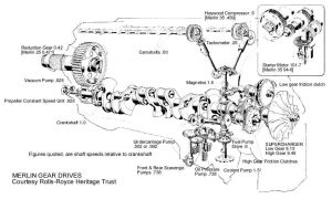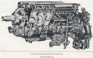 Being an upright, [camshafts mounted uppermost] in line “V” engine, this kept the frontal area to a minimum, cutting down on drag. With a cylinder bore of 5.4″ and a stroke of 6″, the cubic capacity came out at 1650 cu inches, or approximately 27 litres. [Nearly 17 times bigger than a 1.6 litre Ford Focus!]. Ratings varied from around 1,000 hp, to 2,200 hp [RM17SM-30 psi boost] & above. Combat rpm was 3,000. The advent of 100 octane [Esso] fuels, [1944 150 octane] enabled boost pressures to rise, and horsepower with it. This showed without doubt, the amazing strength of the original design.