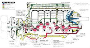 The engine was a veritable mass of gears. The sketch below shows this to great effect. Each bank had a single overhead camshaft, opening and closing four valves [exhaust valves had sodium cooled stems] per cylinder, using long rocker arms. Pistons were a forged design, of 6 to 1 compression ratio. The connecting rods were steel forgings, two per crank throw, six throws in all. Engine lubrication was of the dry sump type, with one pressure side and two scavenge sides. In the drawing below, the pickup tube can clearly be seen in the shallow sump pan. The coloured drawing, shows the lubrication path. At the rear of the engine sat the centrifugal supercharger. This blew down a tube in the centre of the engine, with manifolds leading off to the inlet ports. The carburettor was mounted at the rear, on the bottom of the supercharger, [updraft]. The British Merlin used an SU carb, and the American Packard Merlin used a Bendix Stromberg pressure injected carb.